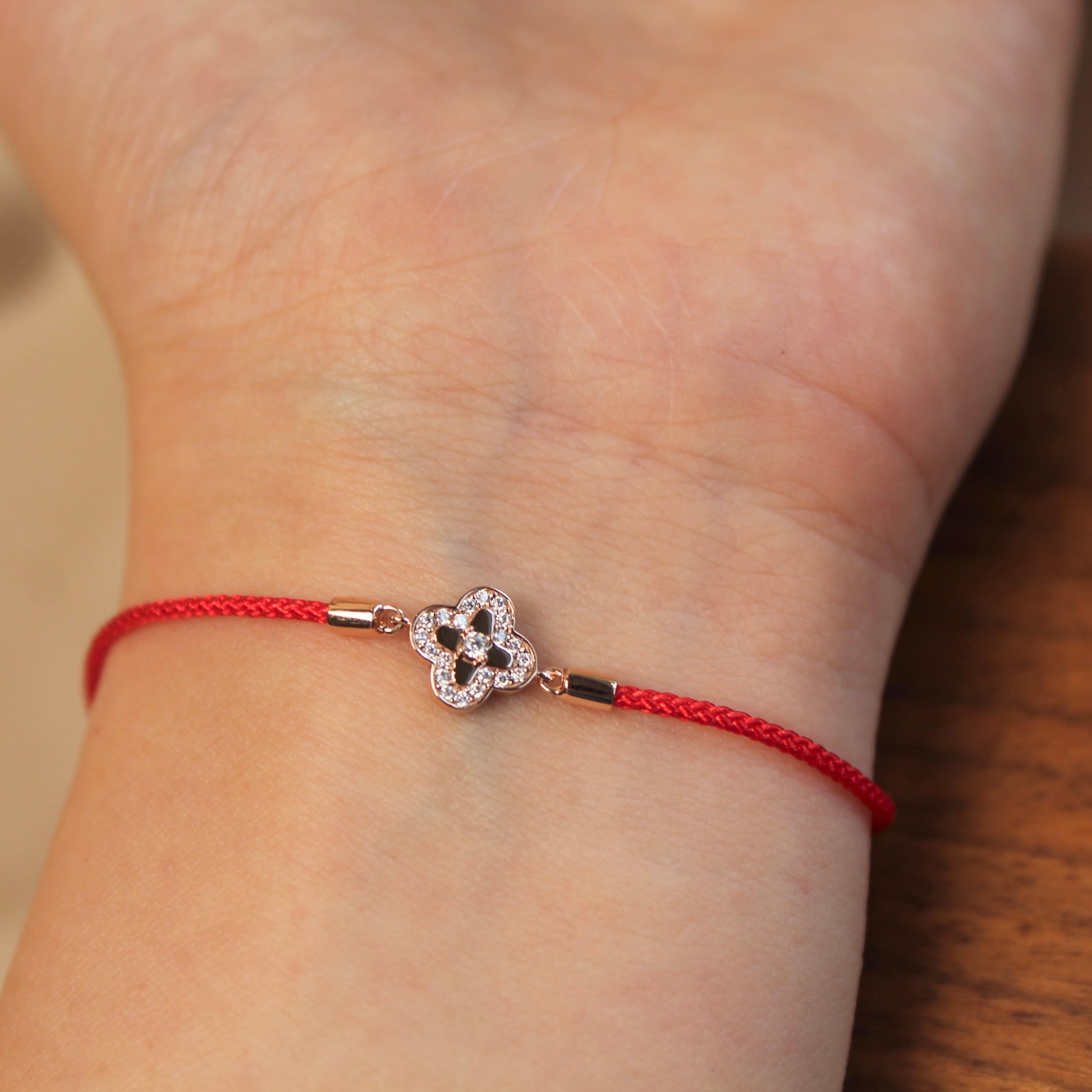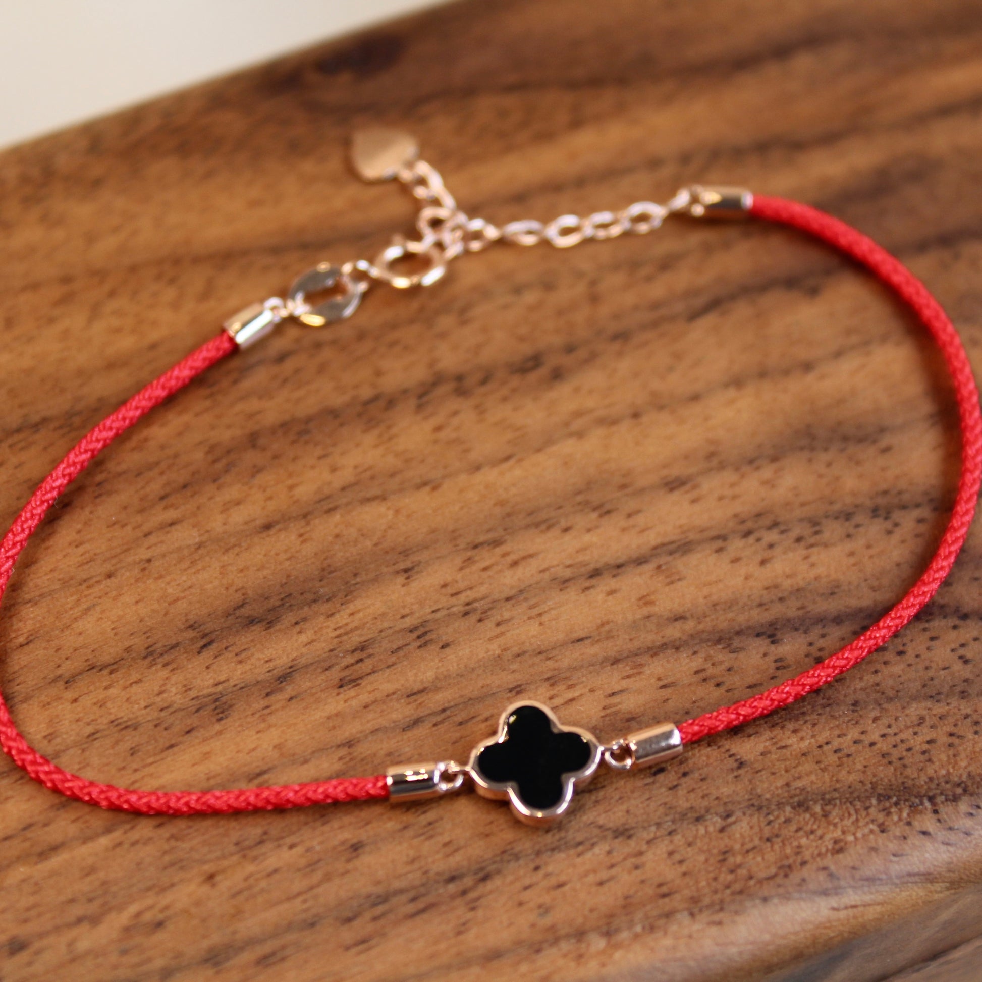 14K Solid Rose Gold Double-Sided Clover Red Bracelet